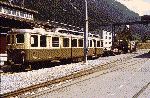Railcar ABDeh 4/4 301 in InnertkirchenYear of construction: 1949Power: 630 kW V max: 70 km/h (adhesion), 35 km/h (cogwheel) Manufacturer: MLM and BBC Photographer: Stefan Dringenberg, 07-28-90 |