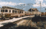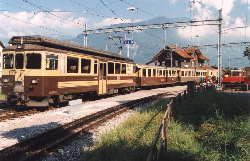 Railcar ABeh 4/4 313 in WilderswilYear of comstruction: 1986Power: 1256 kW V max: 70 km/h (adhesion), 40 km/h (cogwheel) Manufacturer: SLM and BBC Photographer: Klaus P. Canavan, September 1996 |