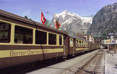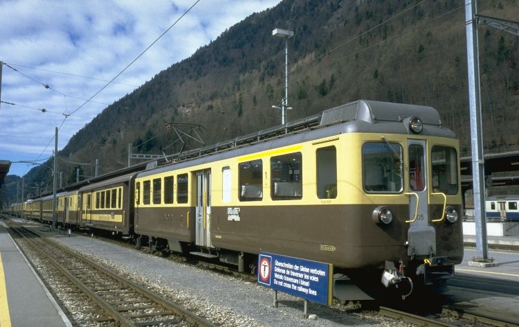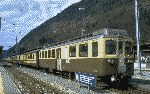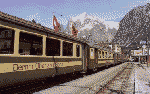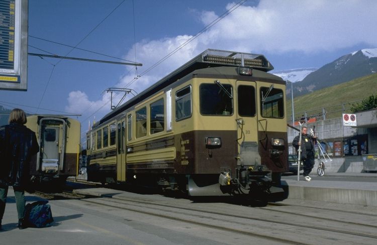Railcar ABeh 4/4 313 in GrindelwaldPhotographer: Klaus P. Canavan, 04-07-96With the four railcars a new paint scheme was introduced in 1986. |