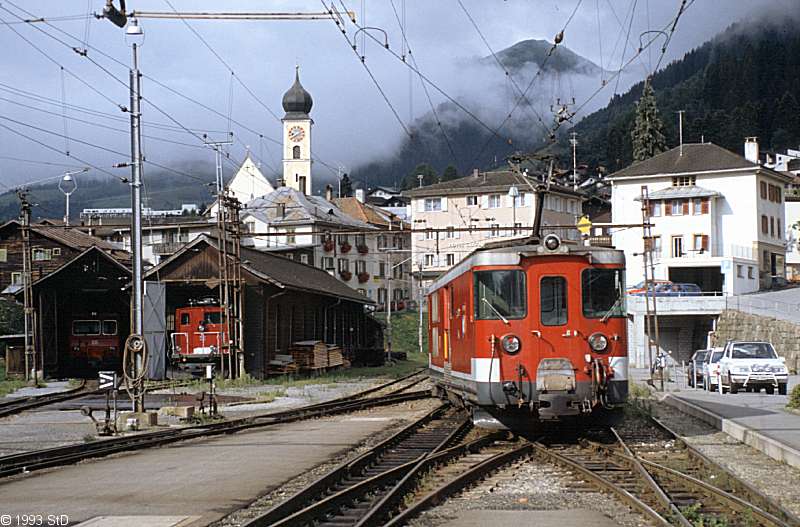 Dieser Anblick ist Geschichte: Von 1998 bis 2001 wurde der Bahnhof Disentis völlig umgebaut. Links im Schuppen stehen eine HGe 4/4 I und eine HGe 4/4 II.