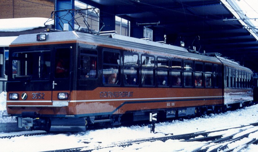 Triebwagen Bhe 4/8 3052 in ZermattBaujahr: 1993Leistung: 201 kW V max: 28 km/h bergwärts, 21 km/h talwärts Erbauer: SLM und BBC Fotograf: Manfred Luckmann, 20.01.1994 |